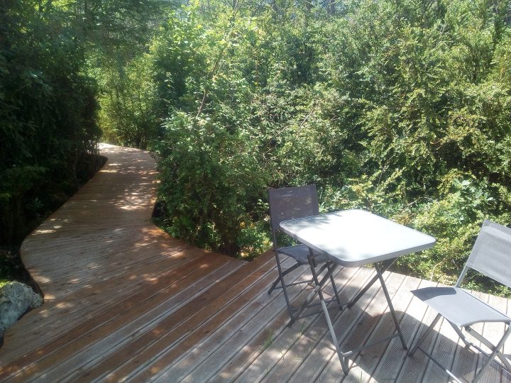 Des toilettes sèches et un point d'eau sur le plate-forme complètent une salle de bain, avec douche et WC, mise à votre disposition durant votre séjour (draps de bain et gel douche fournis).