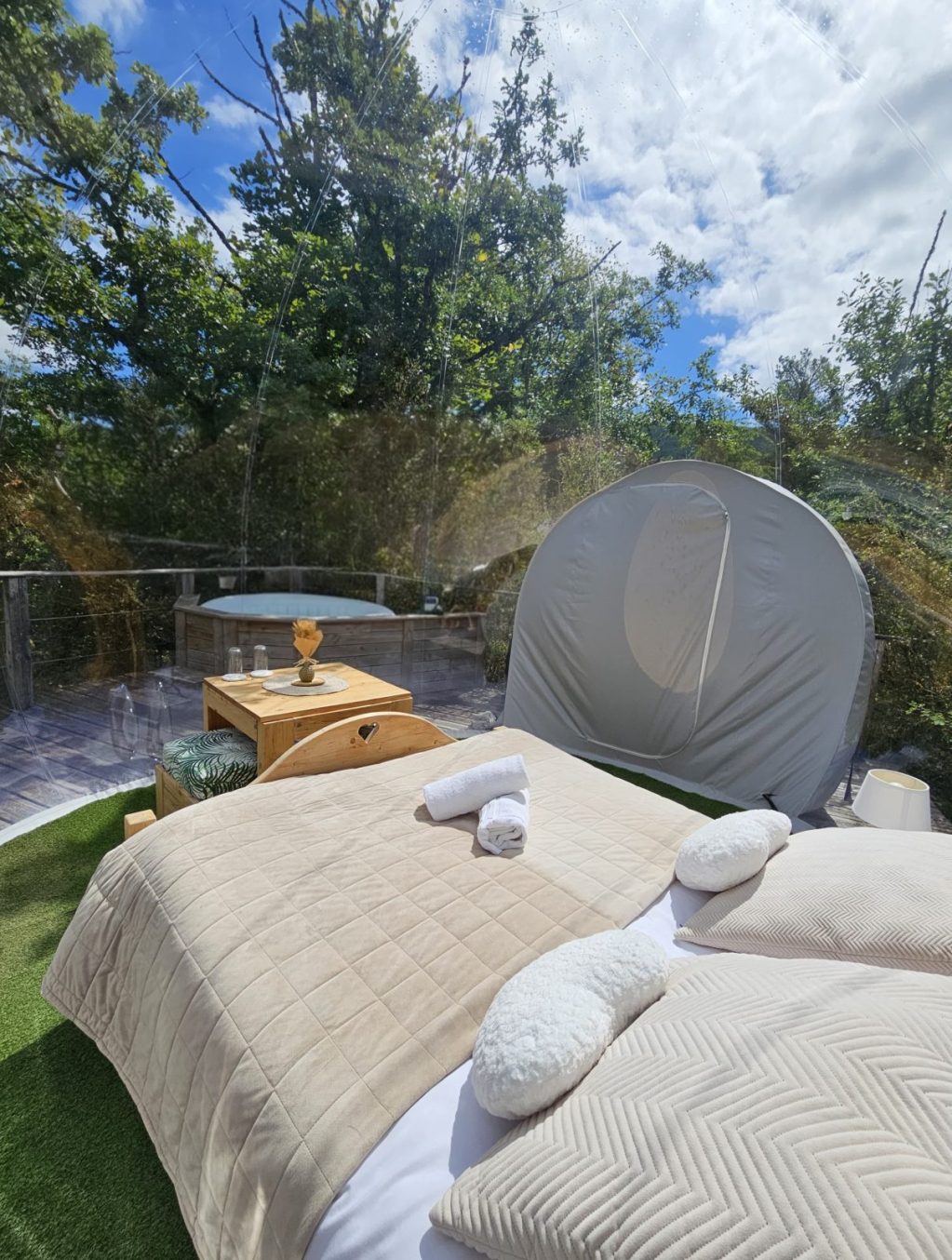 Gonflée sur une plateforme immergée dans la végétation des Géorennes, nos deux bulles vous proposent un lieu de repos tout équipé avec table et salon extérieur mais aussi avec toilettes sèches, salle de bain et jacuzzi privatif (drap, couette, oreillers, serviettes de bain et gel douche à votre disposition).