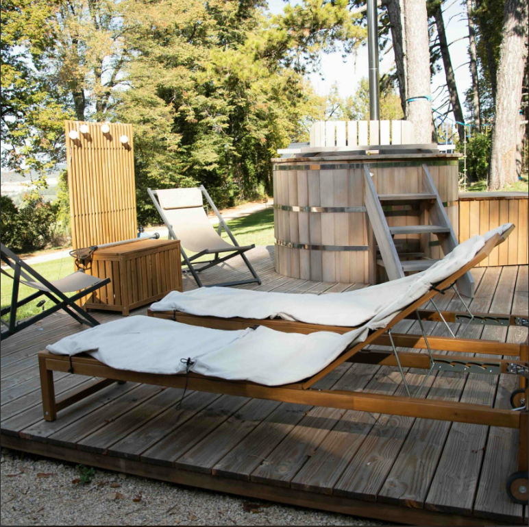 - un spa privatisable, pour la clientèle séjournant sur le site : soit uniquement sur l'aspect extérieur (bain nordique traditionnel artisanal de qualité avec sa terrasse) soit avec en plus un espace intérieur zen tout équipé, comprenant notamment un sauna, peignoirs et gourmandises...