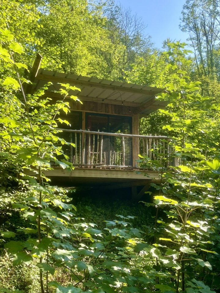 Lodge pour 4 personnes "Ruisseau" (idéalement 2 adultes, 2 enfants) : Logement insolite de 18 m² avec blacon privé. Lits enfants suspendus en filet au-dessus de la nature. Salle de bain privative non attenante