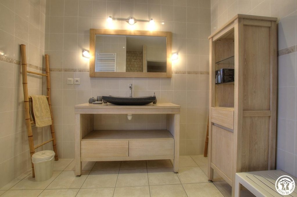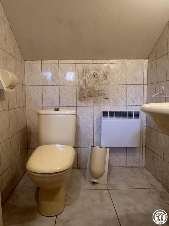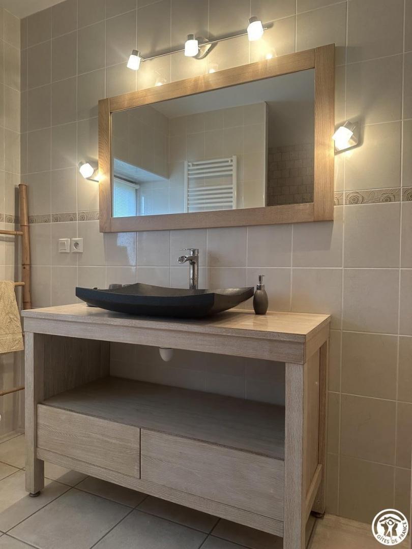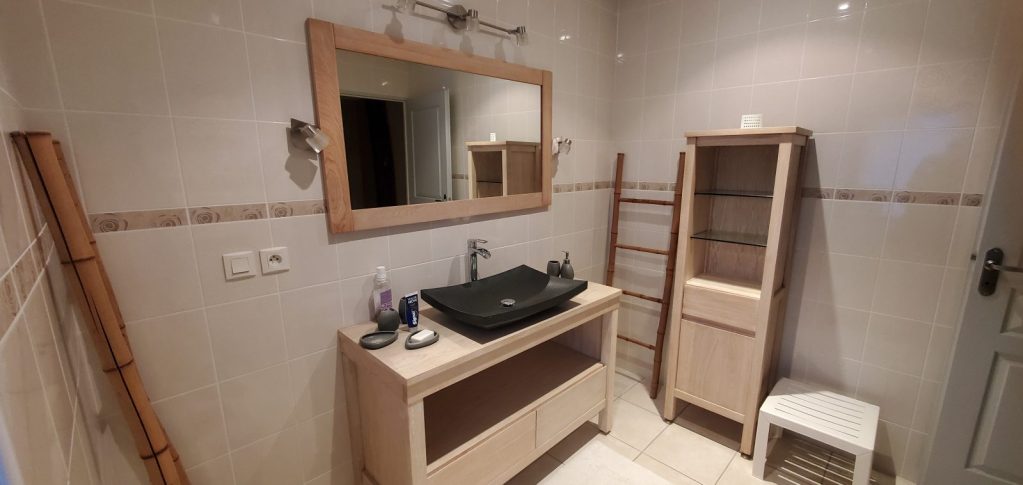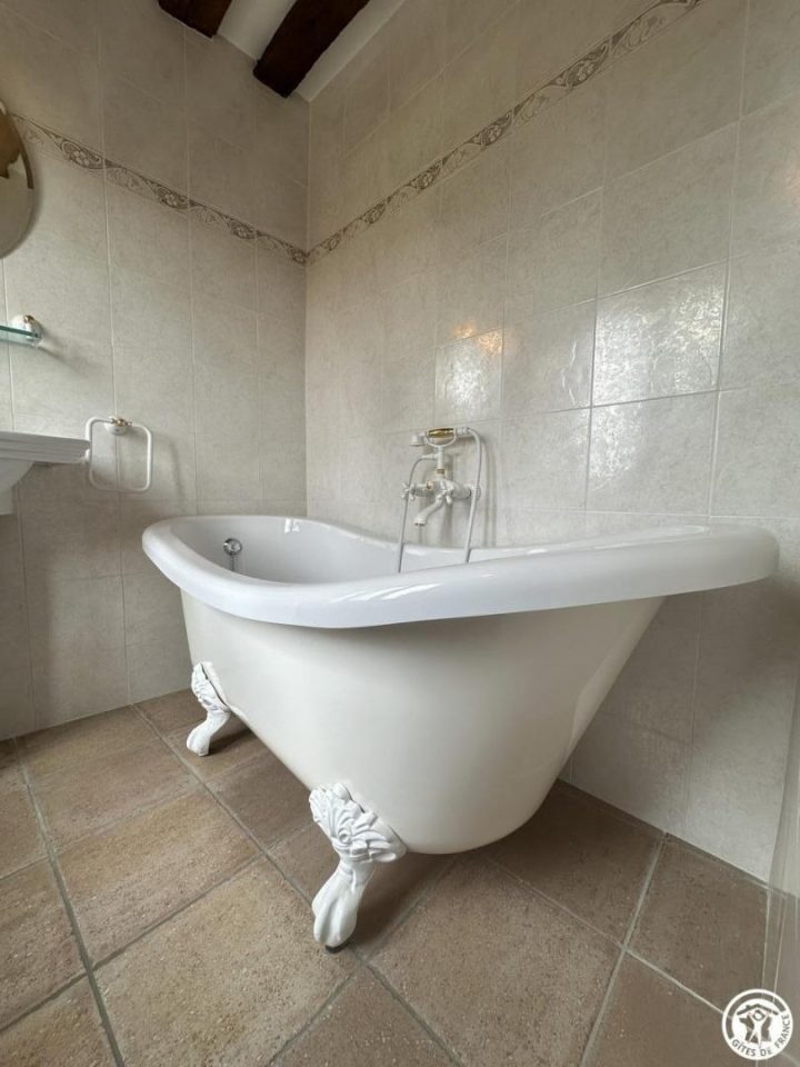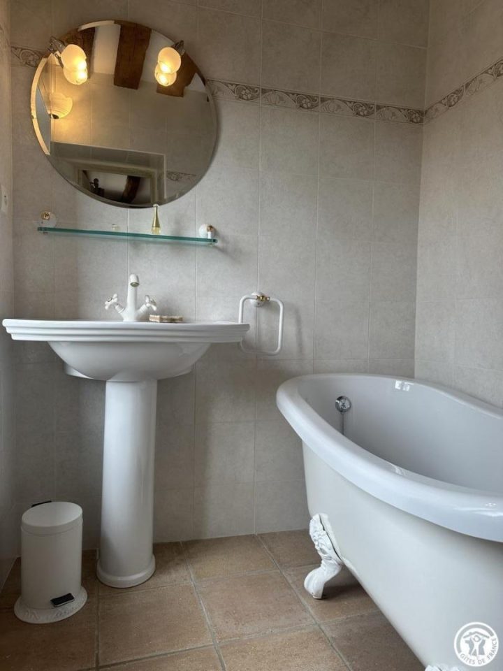 À l’étage, deux grandes chambres avec des salles de bains respectives dont une avec une magnifique baignoire à sabot.