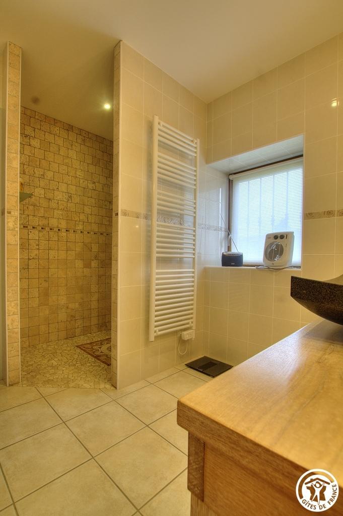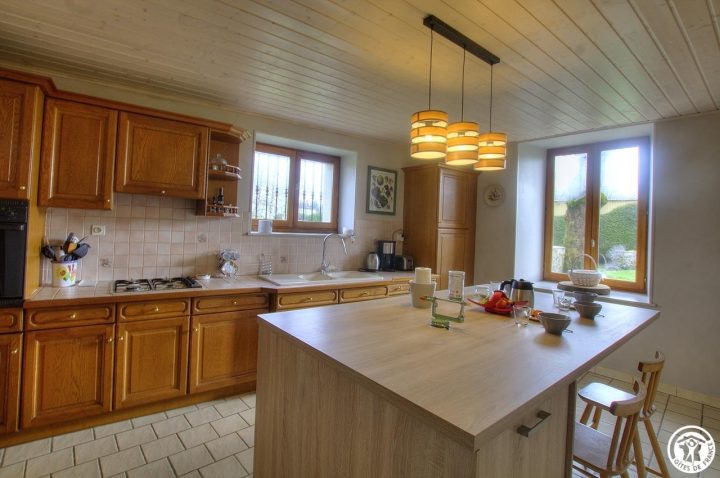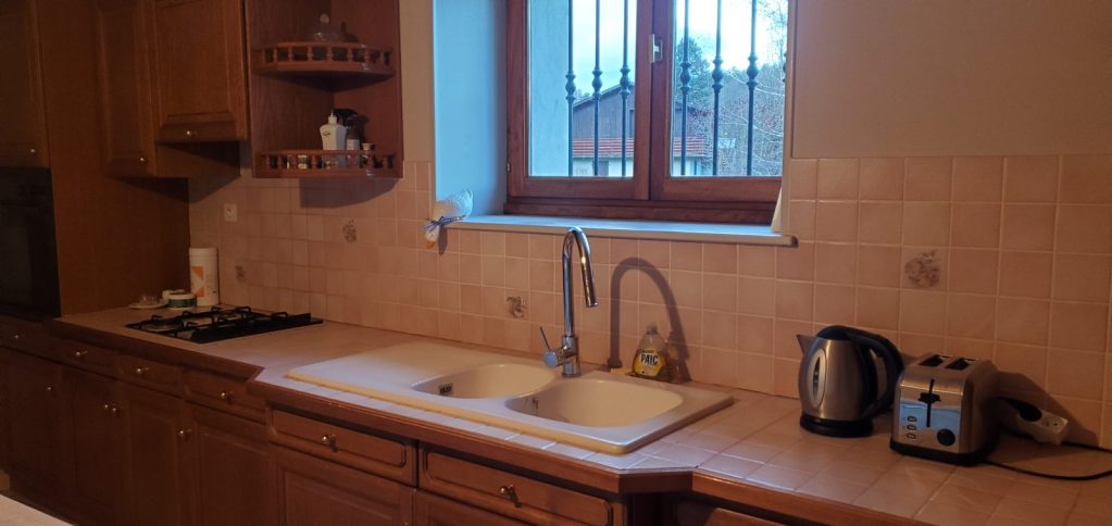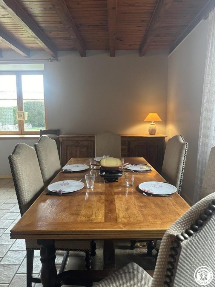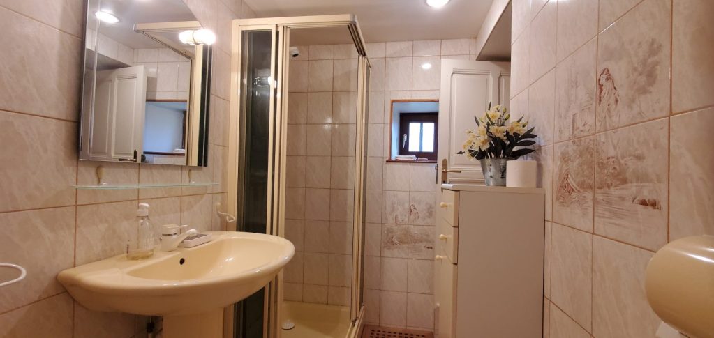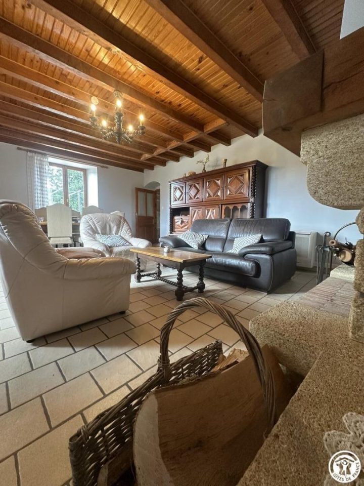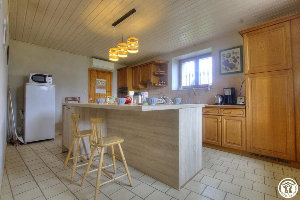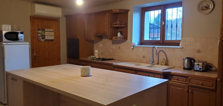 Au rez-de-chaussée, vous retrouverez une cuisine équipée avec un grand ilot central, un salon avec une cheminée à foyer fermé qui chauffe le salon et la cuisine (nous fournissons le bois), et une grande pièce salon/chambre qui conduit à une salle de bain avec douche à l’italienne, buanderie et wc.