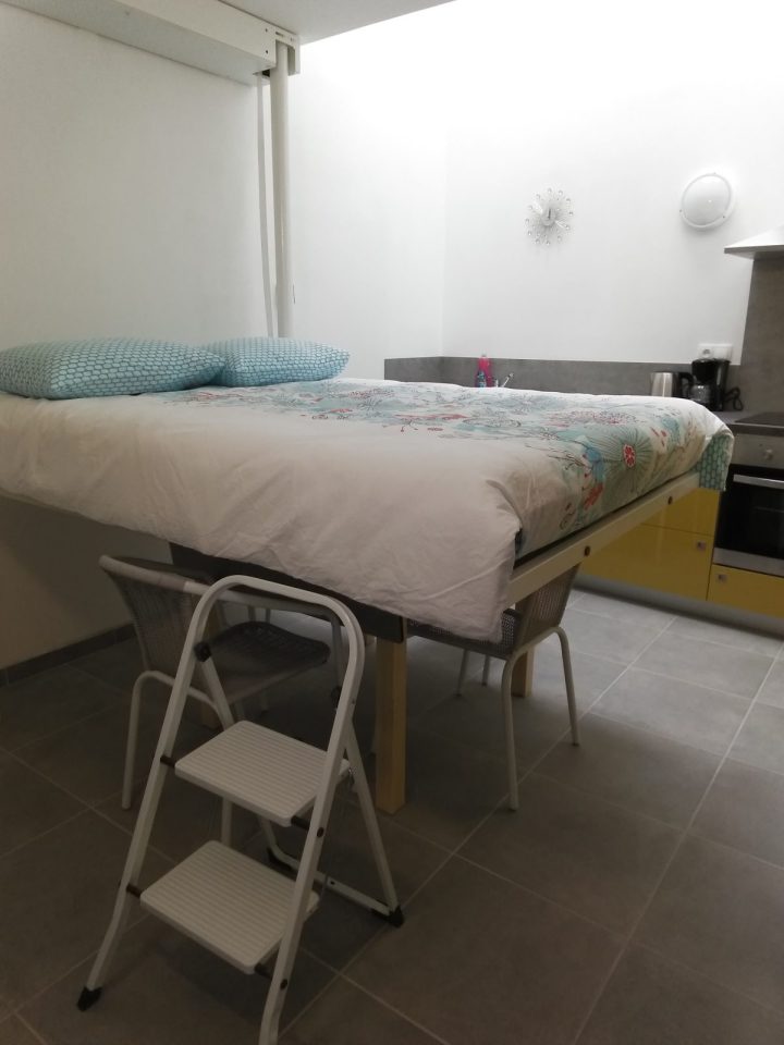Le studio est composé d'une pièce de 13m² comportant une cuisine équipée et un lit escamotable, qui descend du plafond et qui se trouve à 1 mètre du sol une fois descendu, de 140 x 190, puis d'une salle d'eau (douche, lavabo, wc). Il est éclairé par deux vélux.