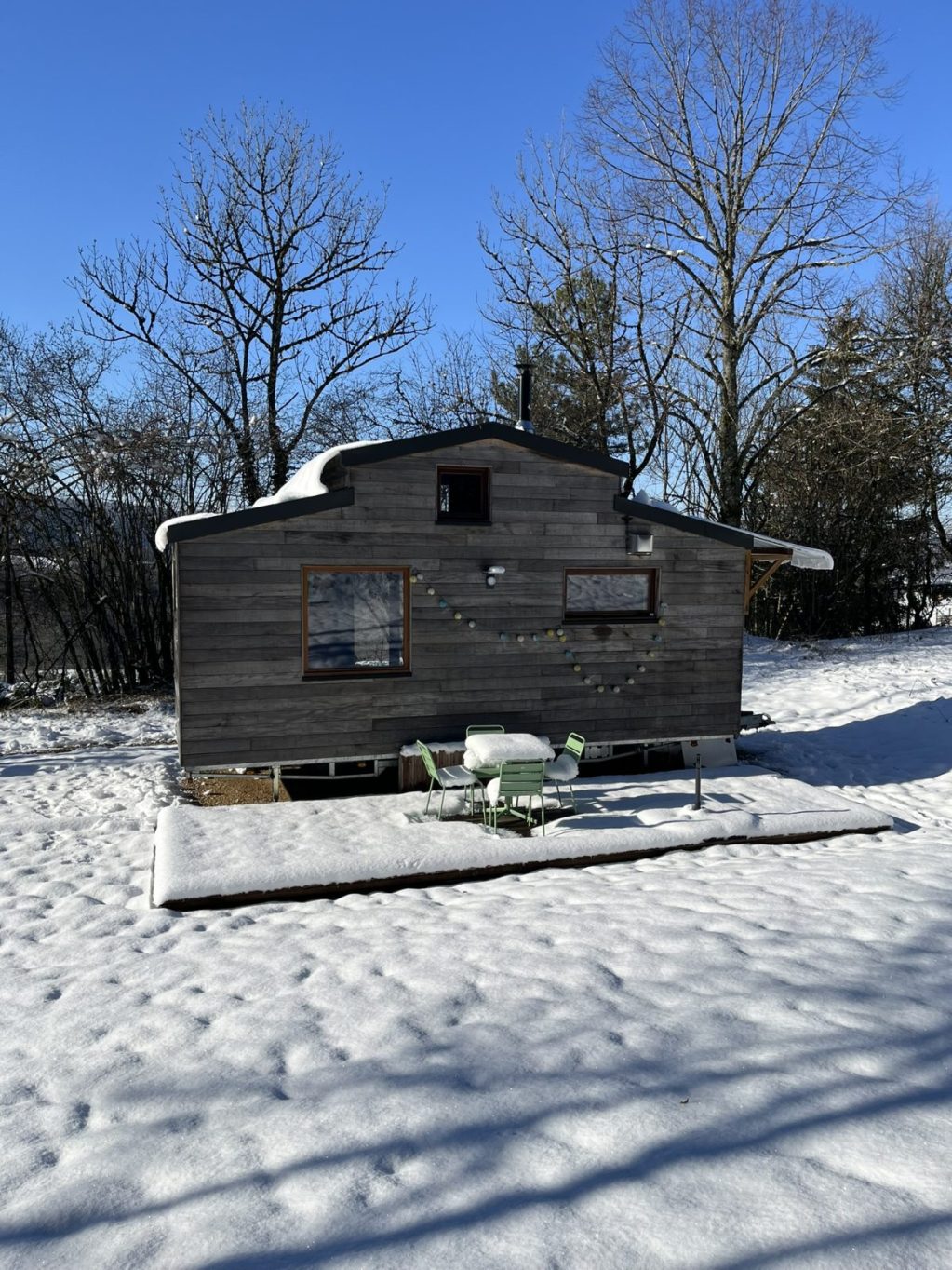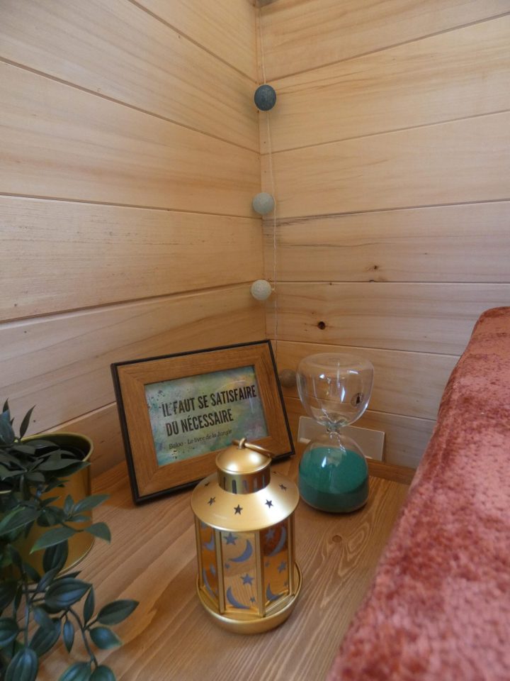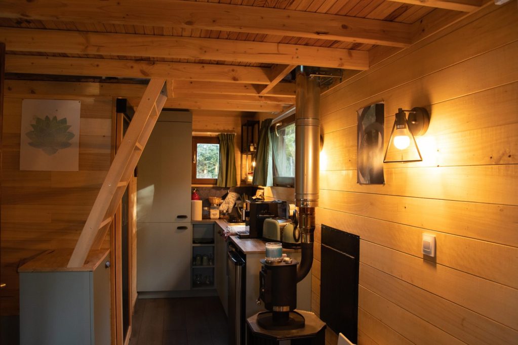 Empruntez le « Petit Chemin des tinys » et vous trouverez notre tiny cosy et romantique au fond du jardin ! Trois marches et une petite échelle vous conduiront à votre chambre dans la mezzanine où vous attendront couette et oreillers moelleux à souhait ! C’est alors au coin du poêle dans le petit salon que vous pourrez vivre un instant hors du temps : lire, écrire, dessiner, ou tout simplement méditer en observant le magnifique cèdre par la fenêtre au son du crépitement du feu. Et pour les plus gourmands, c’est dans cette atmosphère aux odeurs de bois, dans le petit coin repas que vous pourrez déguster au gré de vos envies, une bonne tasse de chocolat chaud supplément chantilly ou une fondue ! Vous l’aurez compris, cette tiny est un petit coin de paradis…Vive le bonheur !