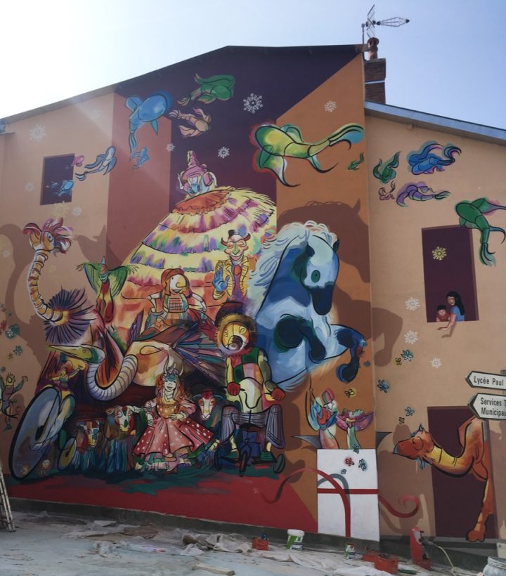 Réalisé par les peintres muralistes de Cité Création, ce défilé de personnages géants et oniriques semble surgir d’une rue en trompe-l’œil.
