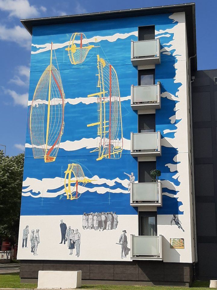 L’œuvre originale d’Alain Coutty, un bateau en lamelles de bois vissées au mur, a nécessité 800 heures de travail. Aujourd’hui recouverte par l’isolation thermique, elle est évoquée par une nouvelle fresque.