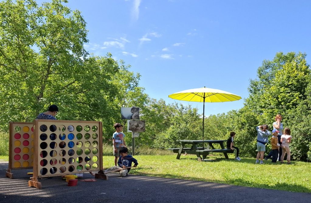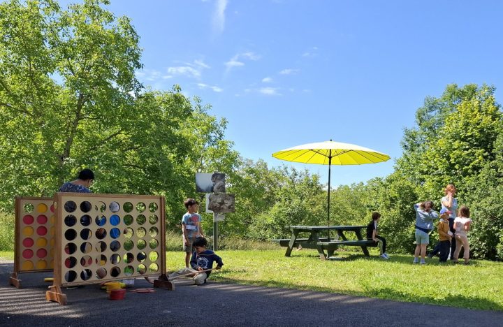 Des tables sont à disposition pour pique-niquer en famille ou entre amis tout en profitant du panorama sur le Bugey et le sommet du Grand Colombier. A la belle saison, des jeux en bois et des hamacs sont en libre-accès dans le parc.