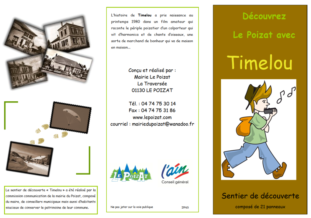 Dépliant gratuit à télécharger sur le site web de la mairie : https://www.lepoizat-lalleyriat.com/tourisme/activit%C3%A9s/timelou/