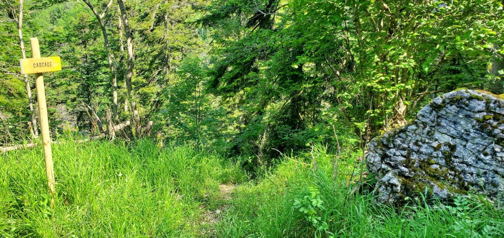 Le chemin part du gros rocher (voir photo) pour descendre au pied de la cascade. Il est quand même nécessaire d'être équipé de bonnes chaussures.