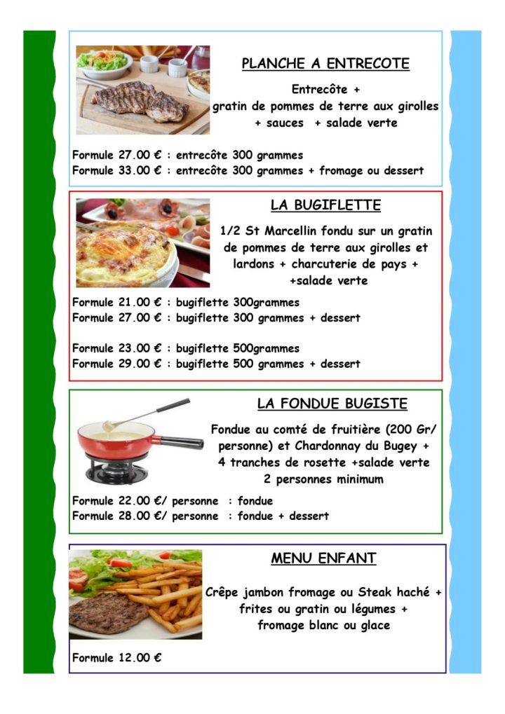 Menu adulte : de 16 à 36 € (Menu Terroir, Planche à entrecôte, Bugiflette, Menu grenouilles, Fondue, Végétarien, Planche à fromages)