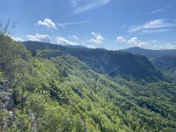 Pour cette seconde journée dans le Haut-Bugey, le cirque d’Orvaz, à 5 minutes du gîte, nous tend les bras. Classé Espace Naturel Sensible par le département de l’Ain, le cirque dévoile un paysage de falaises calcaires qui plongent au fond du vallon creusé par la rivière Sémine. Les enfants rechignent à marcher ? Proposez-leur de suivre la piste du cirque, un parcours aménagé de 5 km qui offre un panorama complet du site. Autour de nous, la forêt, quelques pâtures, la rivière qui cascade par endroits et l’impressionnante masse de la Roche d’Orvaz et de la Roche Fauconnière qui nous dominent. Une dizaine de stations ont été aménagées le long du chemin pour décoder cet environnement tout en s’amusant. Le parcours complet est à réserver aux plus de 10 ans. Pour les plus petits, il est possible de partir du hameau d’Orvaz.